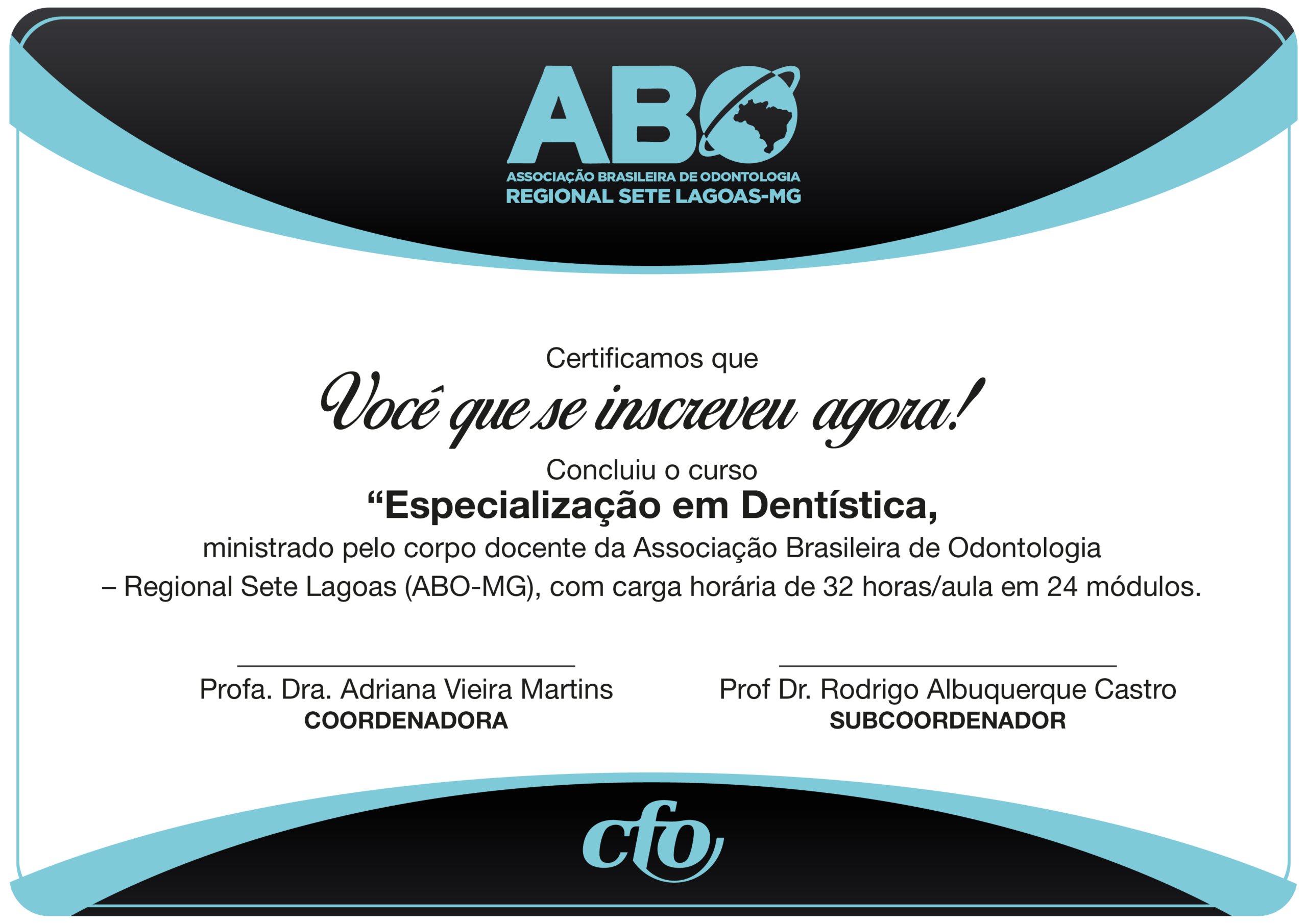 Ao concluir o curso, você receberá o certificado de Especialista em Dentística, emitido pela ABO e reconhecido pelo CFO, que atesta seu conhecimento e habilidade na área.